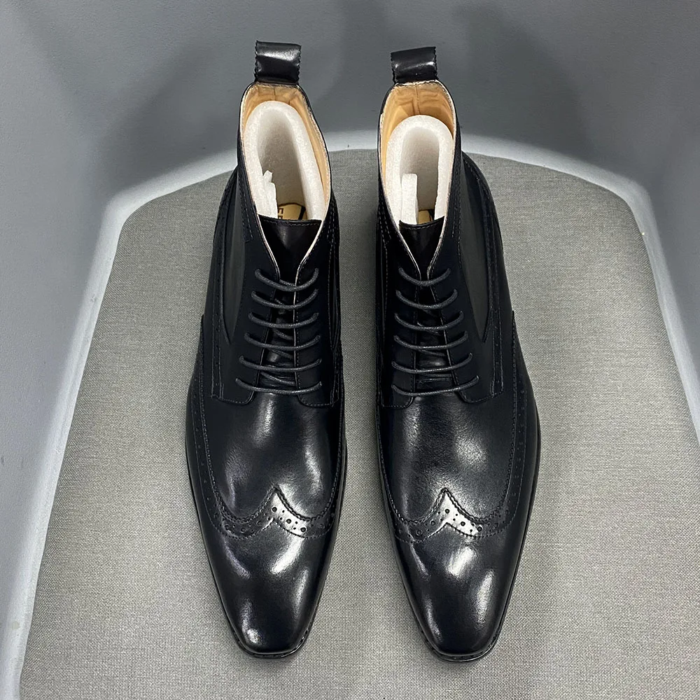 Classic Calfskin Real Leather Cowboy Boot Mens Lace Up Wingtip Pointed Toe Ankle Boots High Cut Formal Derby Shoes for Men